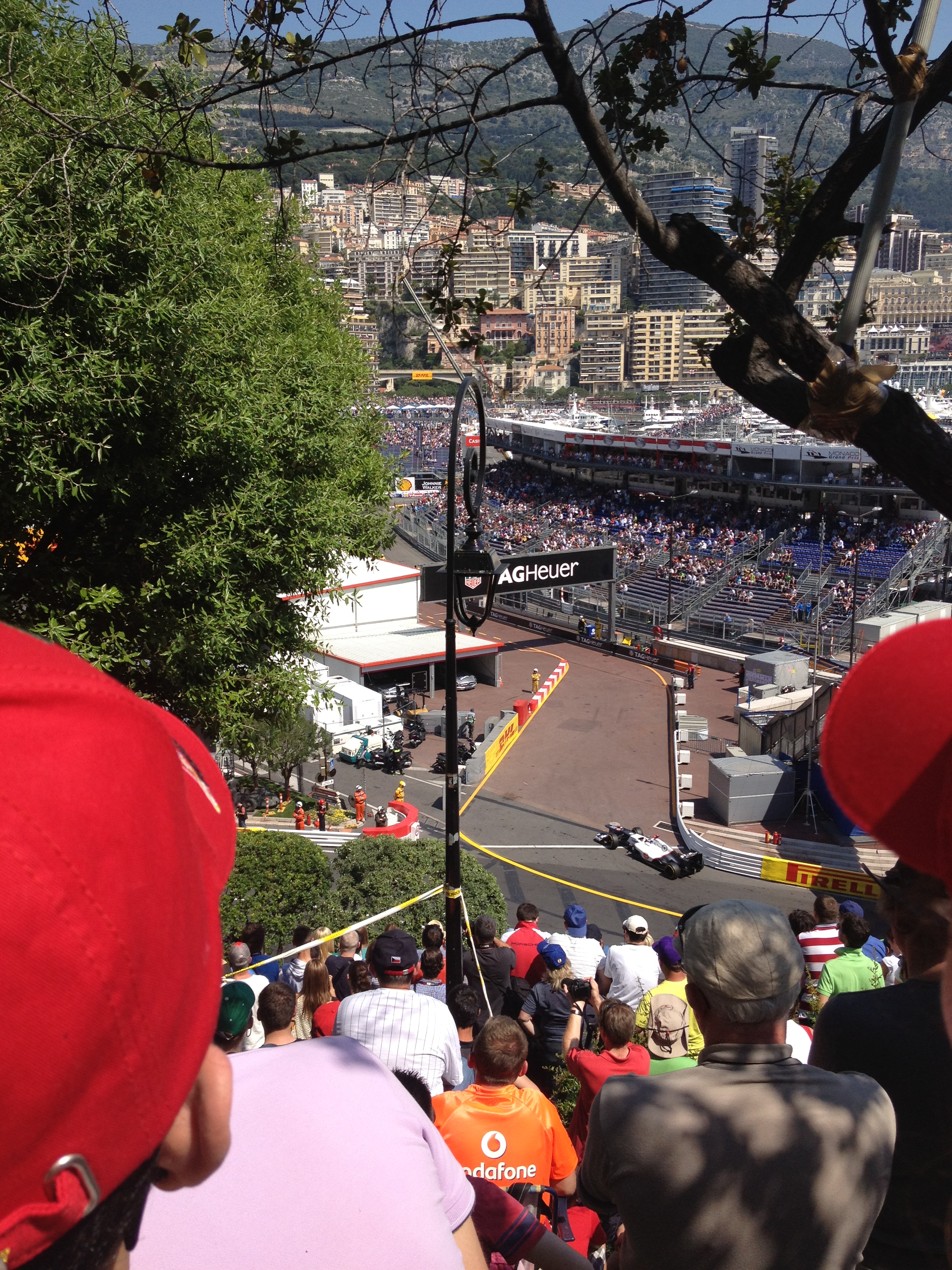 Those who think F1 is too expensive to attend, think again. In Monaco (thought to be the most expensive race in the calendar), you don’t have to pay a penny for basic admission. You can simply wander around the streets, soak up the atmosphere, buy a programme if you want to, and sit outside a bar watching the action on screen, whilst hearing the cars less than twenty feet away. For a mere €40, you can get access to the grassy bank behind Rascasse for the day on Saturday and enjoy the GP2 and GP3 races, F1 practice 3 and qualifying – all exciting action, with all the atmosphere of race day. Or for €70 you can do this on Sunday, to watch the drivers’ parade lap, more racing from the Renault series or Porsche and the actual Grand Prix itself. This is what I tend to do, partly to keep the cost down, but more so because I just love the buzz of General Admission. Anyone who has been to a festival – Glasto, Reading, Leeds, IoW – you’ll know what I mean. Even if it’s pouring down, it’s the experience, the people and the anecdotal stories that make it what it is.