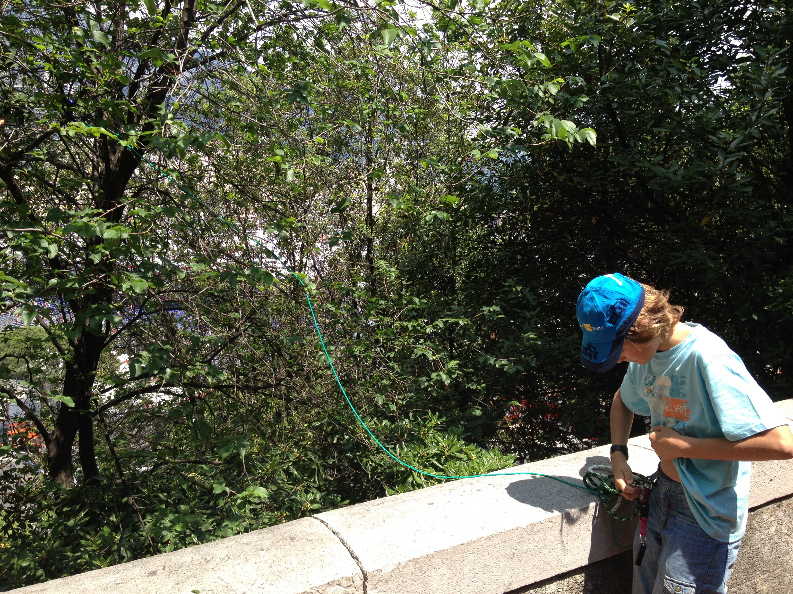Anyway, after smiling affectionately at his little sign – I should call it a banner, the effort in its production far outweighing the impact it’d most likely have – I realised where Jacques had disappeared to. He was now hanging over the wall in front of us, attaching a bungee rope to a tree? WTF? But he knew what he was doing, and in the following 30 minutes, he strung up a climbing rope infrastructure worthy of I’m a Celebrity Get Me out Of Here in the trees before us. Not quite sure what he planned to do with this, I was intrigued! I’d previously seen people watching from the trees, building ingenious contraptions and doing all sorts to equip themselves for the afternoon, so I was gripped to see what this little boy would do next!